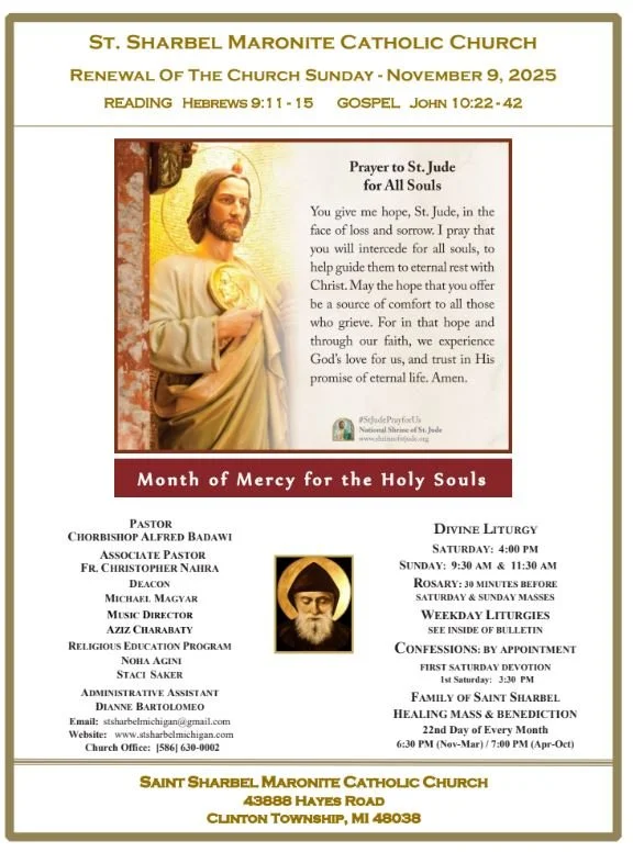 We invite you to join us for our next Healing Mass on November 22, 2025 at 6:30 PM. During this liturgy, we will pray for Saint Sharbel to intercede for our intentions, and everyone present will receive a special blessing with Saint Sharbel oil. Special intentions will be prayed for world peace and the Sanctity of Life. We hope that you will be able to join us!
